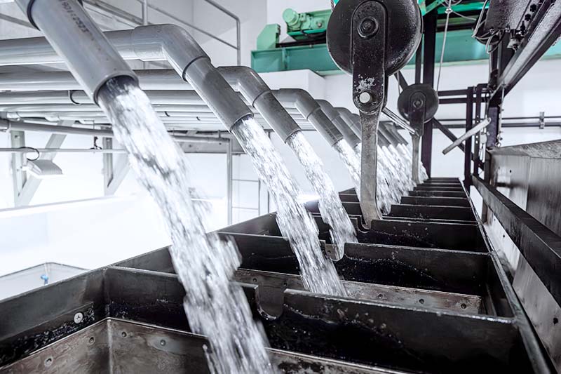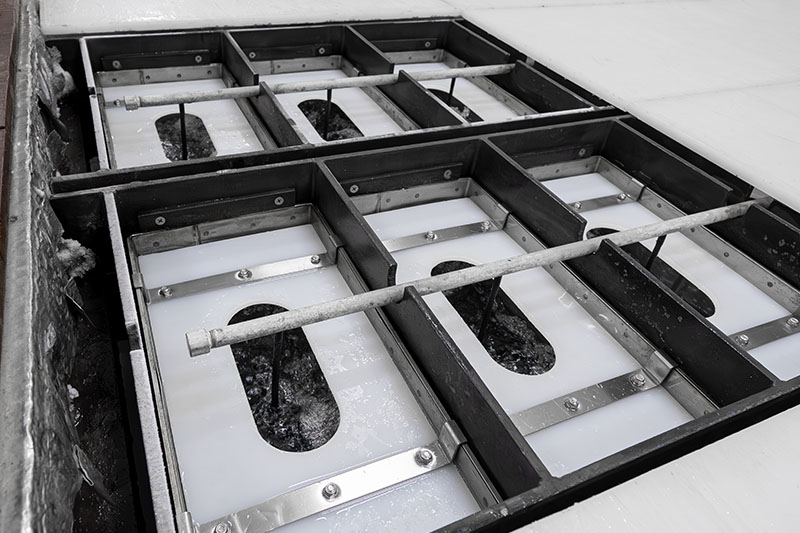 純氷の原料水には水道水を使いますが、当社では逆浸透膜ろ過装置(RO装置)を使って、不純物が殆ど無い純水を使用しています。その原料水を氷缶(氷を製造するための入れ物)に注水します。