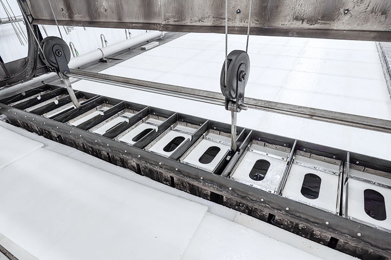 純水の入った氷缶を冷却するための専用タンクに格納。氷を冷やすために使われるブライン(食塩、塩化カリウムなどの濃厚溶液)は、氷点下でも凍らないため−12℃前後に設定し、48時間をかけてゆっくりと冷却します。