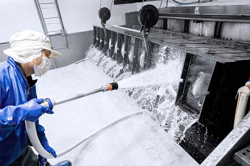 不純物の非常に少ない純水を原料水として、徹底した衛生管理のもと、48時間かけて無色透明な溶けにくく、見た目にも美しい純氷を造っています。それではこれから純氷ができるまでの流れをご覧に入れましょう。